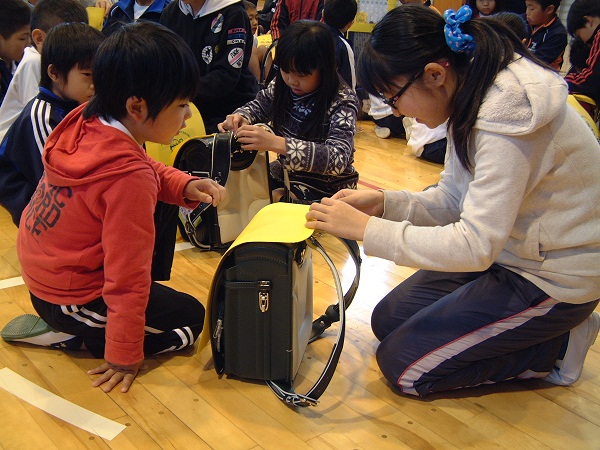 - 委嘱式に合わせて、松崎小学校の1年生にランドセルカバー贈呈式が行われました。 1年生は、6年生に手伝ってもらいながら、ランドセルカバーをつけました。
