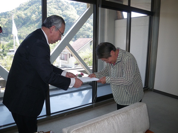 - 静岡県知事より相談員業務の委託を受けることとなった戦没者遺族相談員に町長から委託書が渡されました。