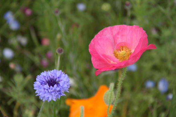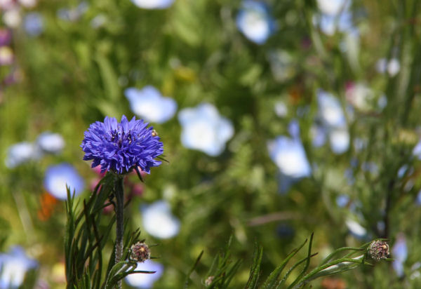 - 那賀の田んぼをつかった花畑では、矢車草が花を咲かせ始めました。現在遠目では、るりからくさの青色やつましろひなぎくの黄色が多く見えますが、また花畑に新たな色合いが加わりそうです。