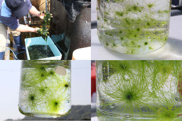 - 川のりの養殖場では、川のりが約30㎝ほどに成長し、水揚げ作業が行われていました。この川のりは、水揚げ後、洗浄、脱水、乾燥の作業を経て、加工品に使われています。