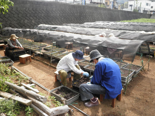 - 老人会の皆様に管理をお願いしている宮内の苗畑では、花の苗の移植作業が行われました。