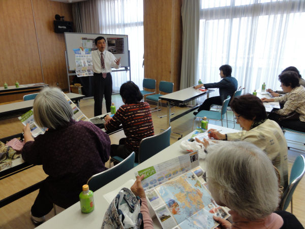 - 花の会総会で、ジオサイト講習会が行われ、出席者は、ジオガイドから室岩洞など町のジオサイトの説明を受けました。