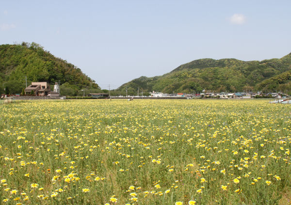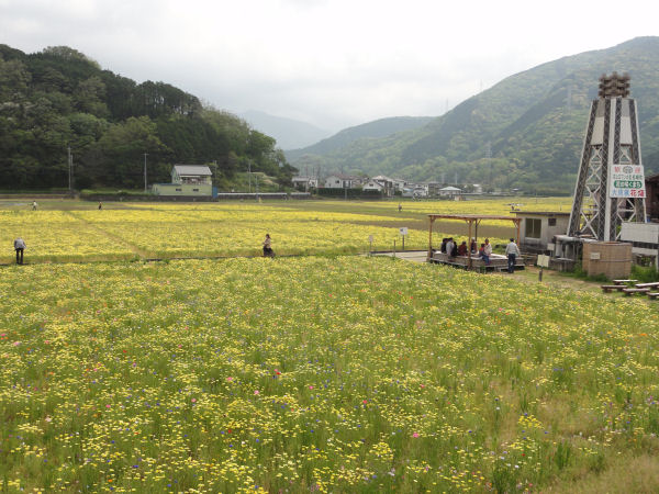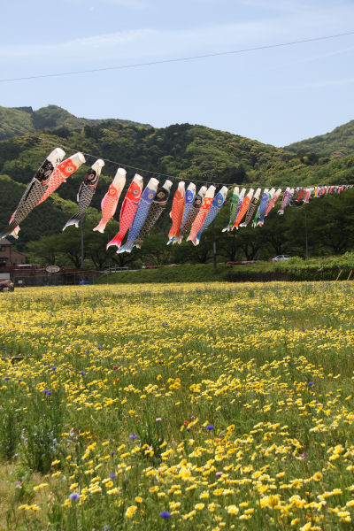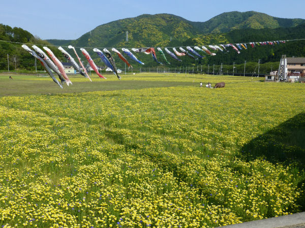 - 那賀の田んぼをつかった花畑では、こいのぼりが風を受け、元気に泳いでいました。花畑では、現在ツマシロヒナギクの開花が好調で、黄色が一面に広がっています。