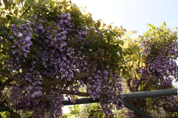 - 町内では、藤が淡い紫色や、白色の花をきれいに咲かせ、見ごろを迎えています。