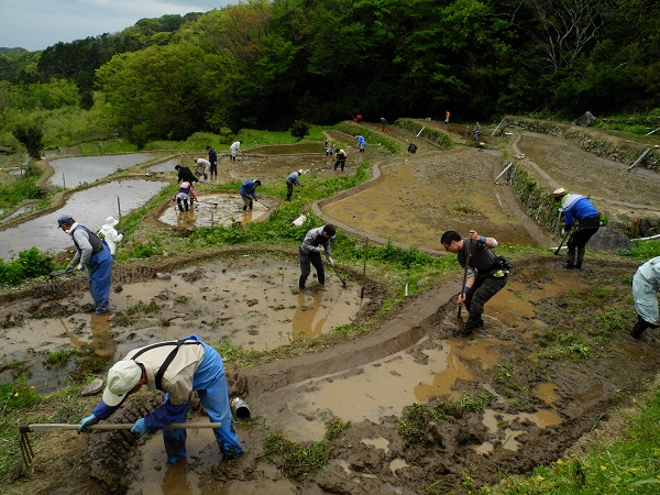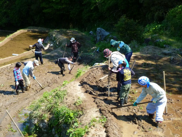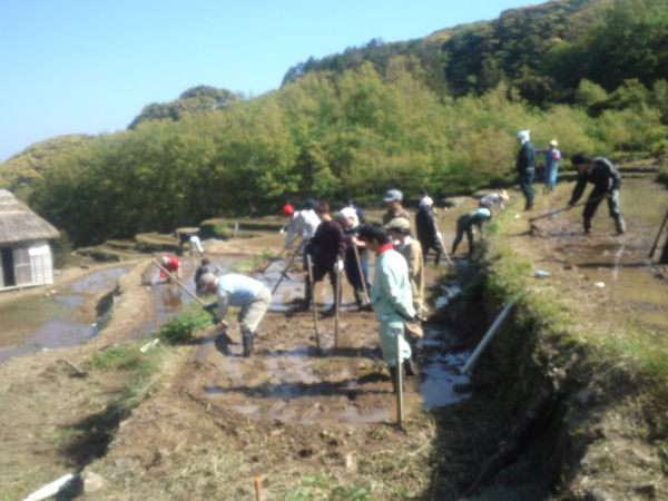 - 平成25年度棚田百笑くらぶの最初の活動となる「畦塗り」が石部棚田で行われました。クラブ員たちは5月の田植祭に向けて、きれいに畦を仕上げました。