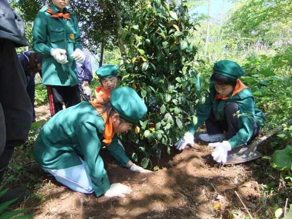 - 平成25年度松崎町みどりの少年団の入団式が、牛原山芝生の広場で行われました。やぶつばきを記念植樹した後、田んぼをつかった花畑にて、緑の羽根募金活動も行いました。