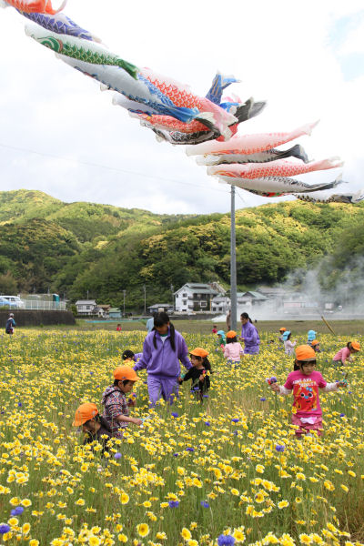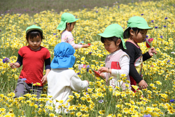 - 那賀の田んぼをつかった花畑では、松崎幼稚園中川園の園児が花摘みを楽しみました。「摘んでも、摘んでもなくならないね。」と楽しそうに話しながら、ハサミを上手に使って花を摘んでいました。