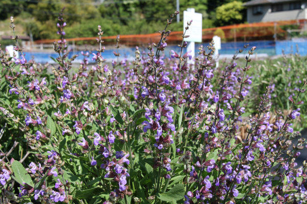- ハーブ実証栽培事業の畑では、34種類植えたハーブの内の一つ「コモンセージ」が花を咲かせていました。このハーブ園で栽培したものが、バスハーブや芳香蒸留水に加工され、「道の駅」花の三聖苑などで販売されています。