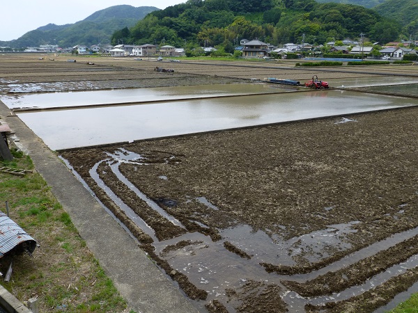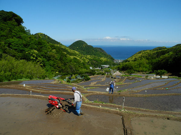 - 石部の棚田では、来週の田植え祭に向け、畦の草刈り、代掻き作業が行われています。