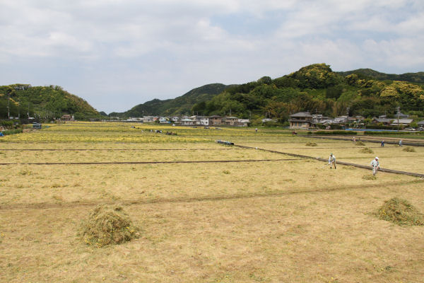 - 5日まで花摘みで無料開放していた那賀の田んぼをつかった花畑では、残っている花の刈取り作業が始まりました。