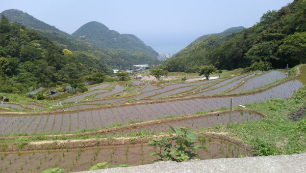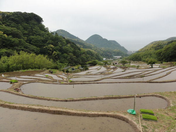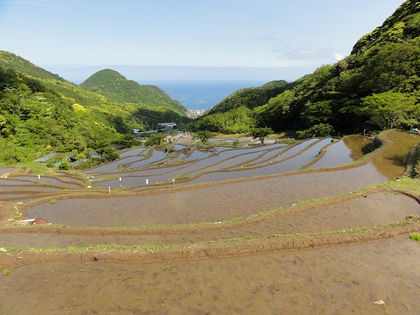 - 昨日まで田植えが行われていた、石部の棚田です。これからの苗の生長が楽しみです。