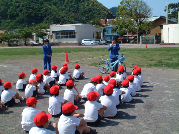 - 昨日の話題ですが、松崎小学校低学年を対象に自転車教室が行われました。参加した児童は、交通安全指導員から説明を受け、安全な自転車の乗り方について学びました。
