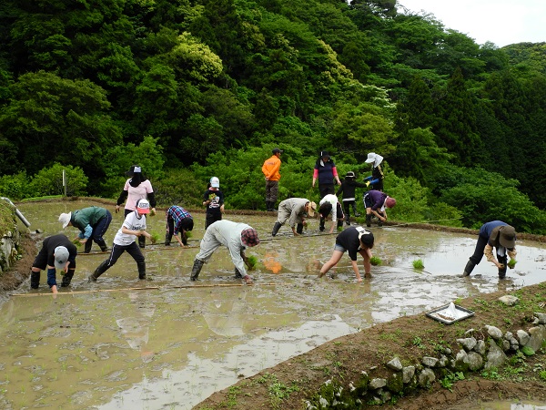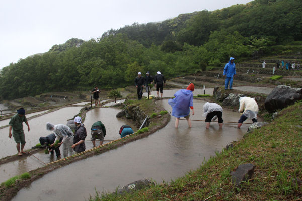 - 石部棚田では、オーナーやトラスト会員が参加し田植え祭が行われました。 あいにくの天候でしたが、参加者は作業の説明を受けた後、自らの区画へ行き田植え作業に取り組みました。