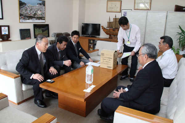 - ネッツトヨタから町へ防災用品(飲料水)の寄贈がありました。寄贈を受けた飲料水は、町内の幼稚園、小学校、中学校に備蓄されます。