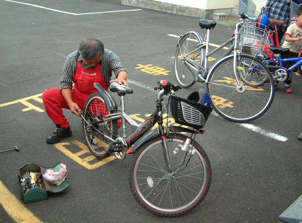 - 中川、岩科、三浦地区の小学校児童を対象とした自転車点検が実施されました。町内の自転車業者の協力のもと、ブレーキ、タイヤ、チェーンなどが点検されました。