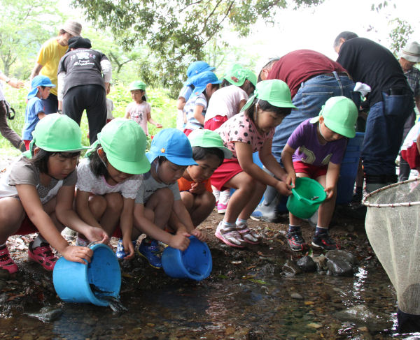 - 6月1日のアユ釣り解禁を前に、那賀川漁協は、稚アユの放流を行いました。今日は、松崎幼稚園中川園の園児も参加し、あゆの放流を体験しました。