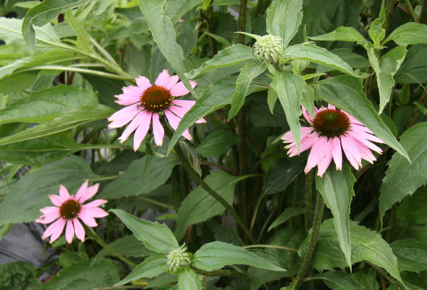 - ハーブ実証栽培事業の畑では、34種類植えたハーブの内の一つ「エキナセア」が直径10センチほどの花を咲かせていました。