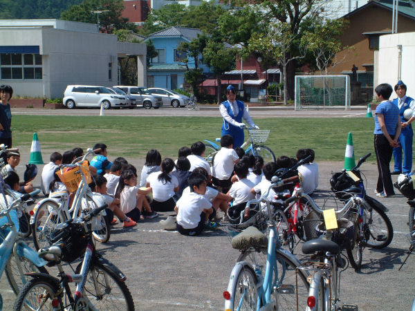 - 松崎小学校では、高学年を対象に自転車点検、自転車教室が行われました。児童は、交通安全指導員の方から、安全な自転車の乗り方について学びました。