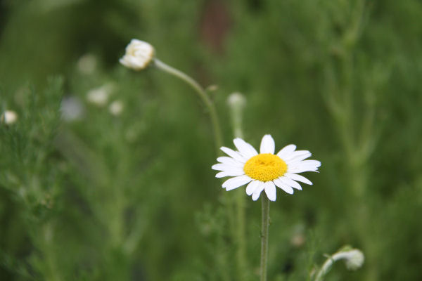 - ハーブ実証栽培事業の畑では、34種類植えたハーブの内の一つ「ローマンカモミール」が白い花を咲かせています。