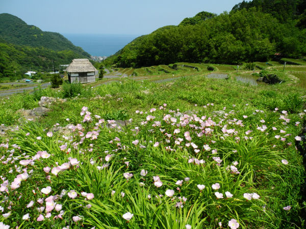 - 石部棚田では、ヒルザキツキミソウが咲き始めました。 今週末の11、12日には、棚田で田植祭が予定されています。