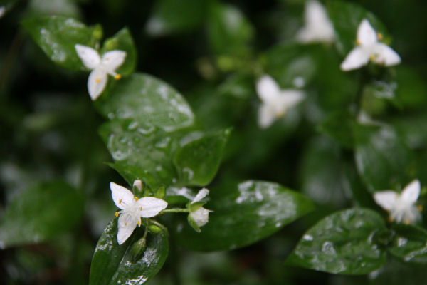 - 道路沿いなどでは、トキワツユクサが三角形のまっ白な花を咲かせています。今日は、午後から降り出した雨に濡れていました。