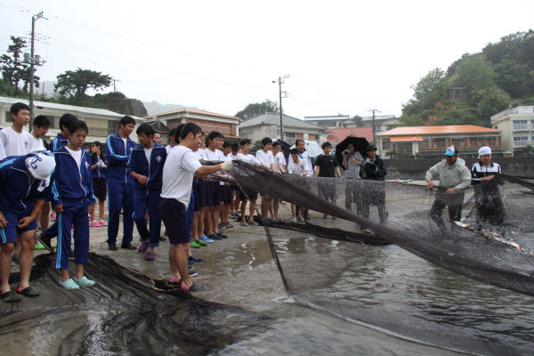 - 愛知県の中学校の生徒が修学旅行で岩地を訪れています。今朝は、あいにくの天候でしたが、地引網体験が行われました。