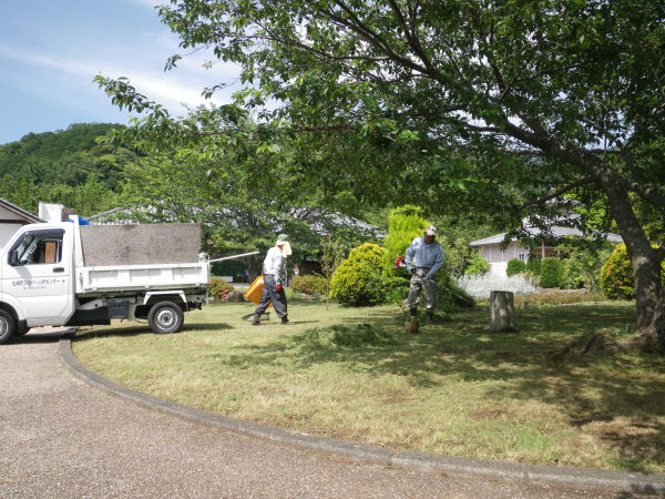 - シルバー人材センター職員の8人の方が、ボランティアで「道の駅」花の三聖苑の草刈りをしてくださいました。