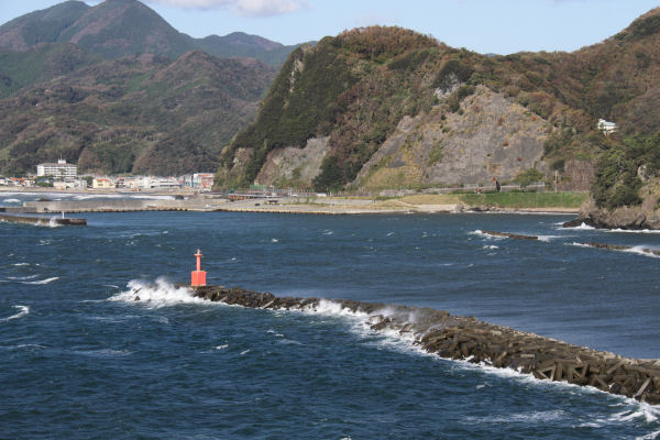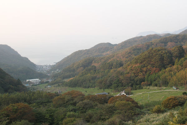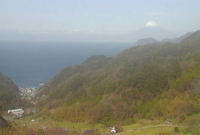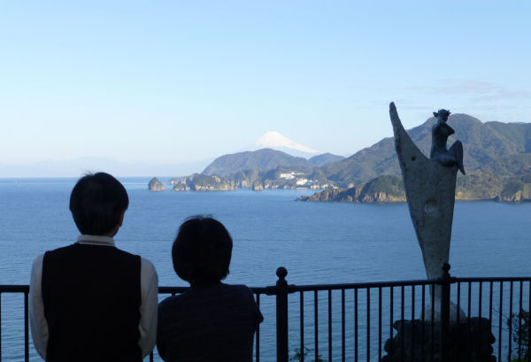 - 町のジオポイントの一つ、室岩洞の展望所からの眺めです。天気が良い日は、駿河湾と山並みの先に、富士山を望むこともできます。