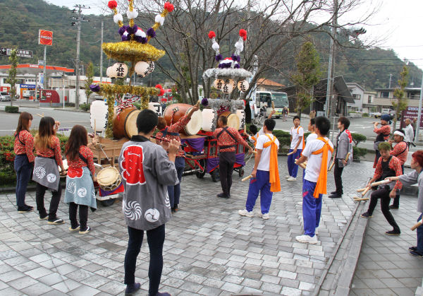 - 伊豆の長八美術館前では、道部区の丁壮社による太鼓演奏が行われました。美術館に訪れたお客様も足を止め、笛や太鼓の音色を楽しんでいました。