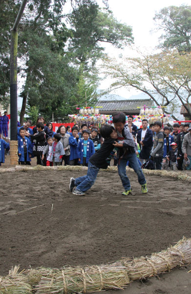 - 伊那上神社では、共盟社(宮内区)と伏青会(伏倉区)の奉納相撲が行われました。 奉納相撲終了後は、子ども相撲が行われ、集まった子どもたちが参加しました。