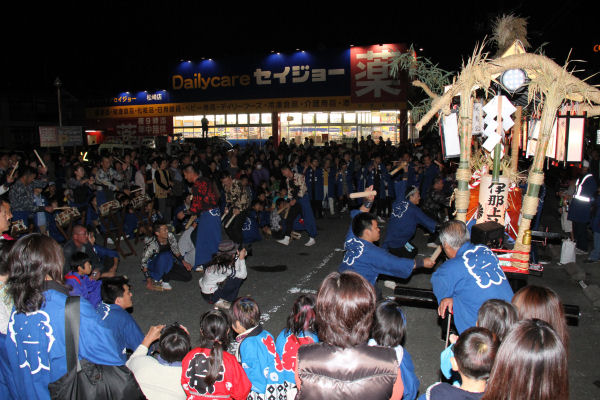 - 昨夜、ドラッグストア駐車場では、三社(桜青会:桜田、伏青会:伏倉、共盟社:宮内)が集まり、太鼓の揃い打ちを披露しました。揃い打ち終了後は、各太鼓台からお餅・お菓子まきが行われました。