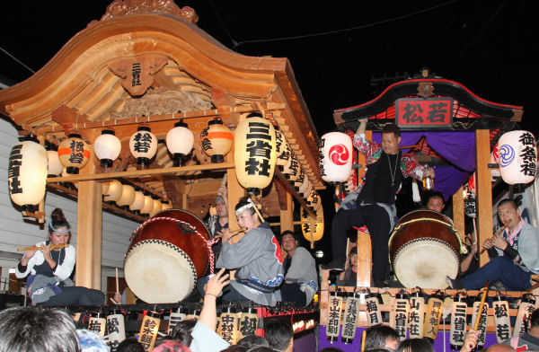 - 昨夜、商店街では秋まつりの最後を飾る「三社たたき合い」が行われました。迫力のある太鼓や笛が披露され、活気に満ち溢れていました。