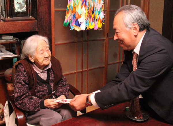 - 100歳を迎えた齋藤みささん(岩地)のお宅を町長が訪問し、お祝いをしました。齋藤さんは「ありがとうございます。」と笑顔で答えました。