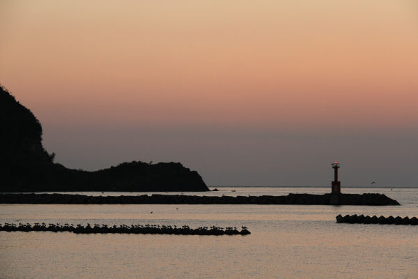 - 夕暮れの松崎海岸です。消波ブロックの上で、たくさんのカモメが羽を休めていました。
