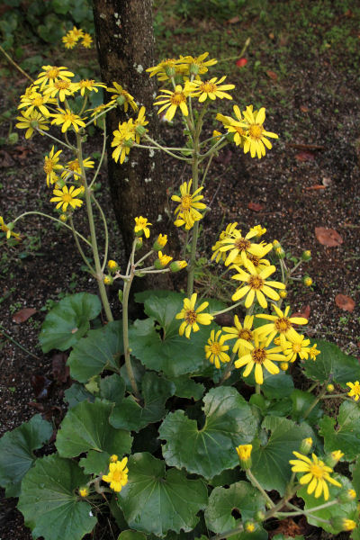 - 町内各所で、町の花でもあるツワブキが見ごろを迎えています。今日は、あいにくの天候でツワブキの花も雨の滴に濡れていました。