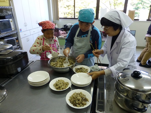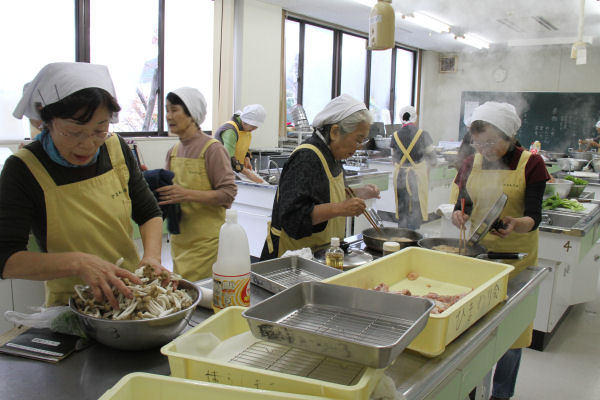- 棚田百笑くらぶの11月の活動は、先月収穫した棚田米を使った料理教室です。栄養士の森優さんの指導のもと、炊き込みご飯や茶わん蒸しなどを作りました。