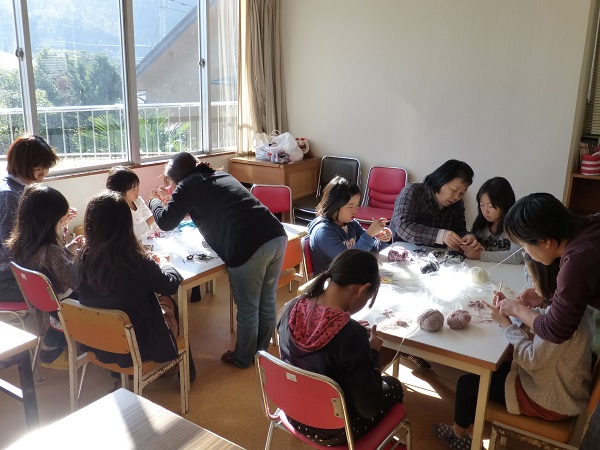 - 児童館では、小学生を対象とした「こものづくり教室」が開催され、参加者は毛糸を編み方を教わりながらヘアーバンドを作りました。