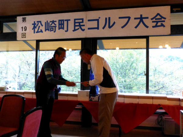- 天候に恵まれ、第19回松崎町民ゴルフ大会が開催され、地域交流をしている長野県松本市安曇地区の方を含む75名が参加しました。 表彰式では、大会のチャリティー募金が松崎町社会福祉協議会へ贈られました。