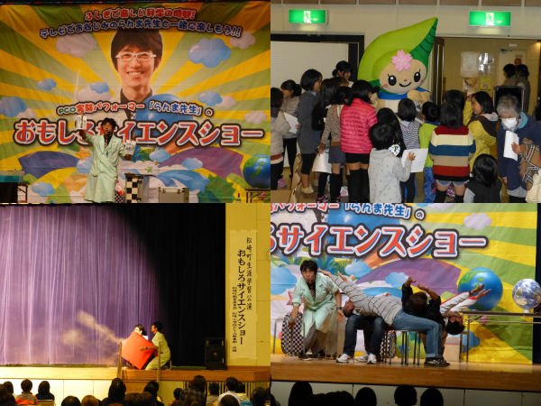 - 昨夜の話題ですが、松崎町生涯学習公演「おもしろサイエンスショー」が開催されました。 松崎町のマスコットキャラクターのまっちーも来場者をお出迎えしました。
