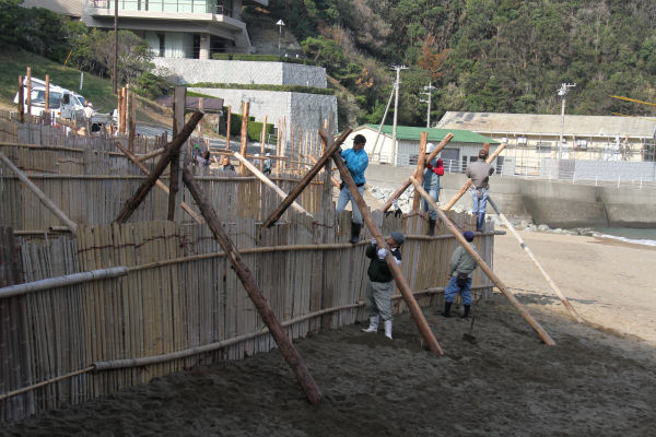 - 雲見海岸では、冬の季節に吹く西風に備え、砂の飛散防止のための浜囲い設置作業が行われました。