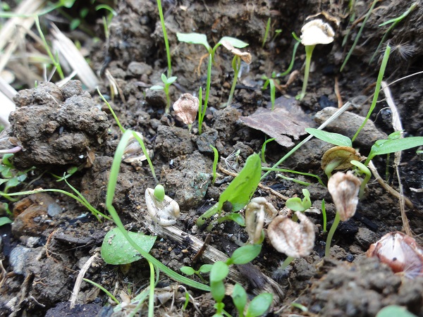 - 那賀の田んぼをつかった花畑では、所々に芽が出始めました。 早く大きく育ち、花が咲いてくれるのが楽しみです。