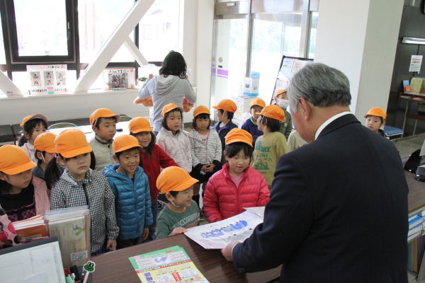 - 聖和保育園の園児が、勤労感謝の日にちなみ、日ごろのお礼にと、役場を訪れました。手作りのカレンダーなどをプレゼントしていただき、歌も披露してくれました。