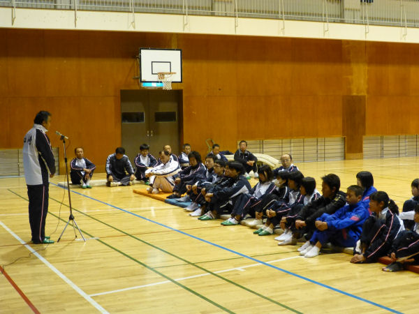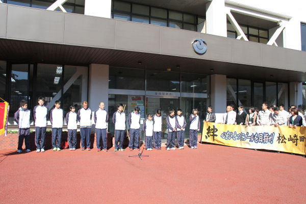 - 昨夜の話題ですが、松崎小学校体育館では、市町対抗駅伝チームの壮行会が行われました。町長の激励を受け、選手たちは大会へ向け、士気を高めました。