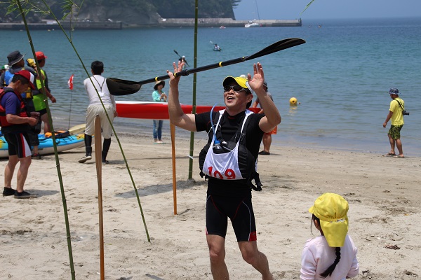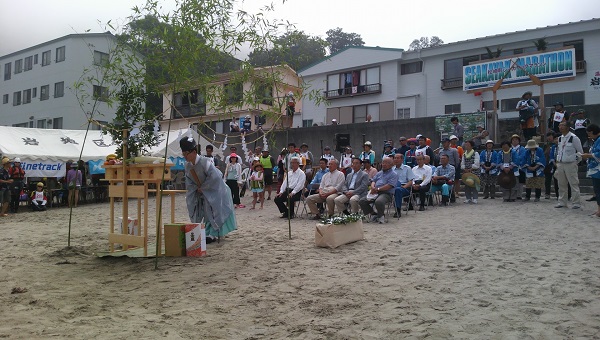 - シーカヤックマラソンのスタート前には、海水浴シーズンの海の安全を祈願する、岩地海岸海上安全祈願式が行われました。