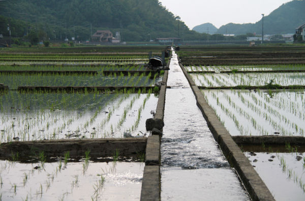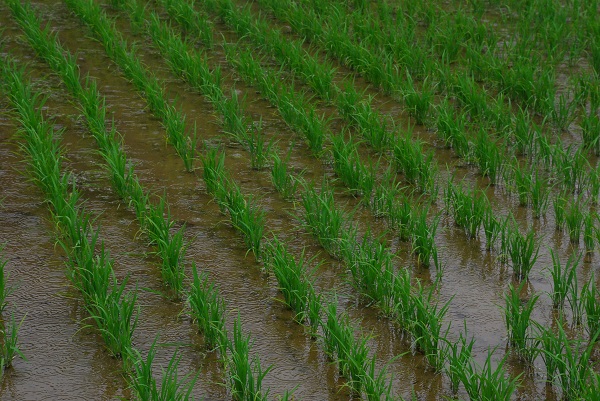 - 苗の植えられた田んぼに雨が落ち、無数の波紋が広がっています。