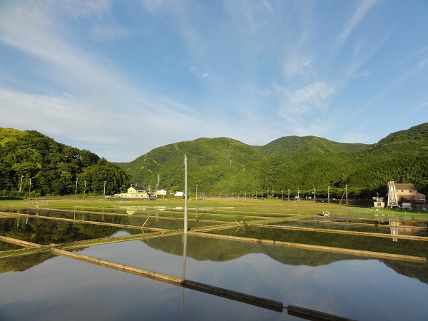 - 石部の棚田では、昨日、石部棚田保存会の方たちによる畦の草刈り作業が行われ、畦が綺麗になりました。5月の田植えから1ヶ月が経ち、稲も元気に成長しています。