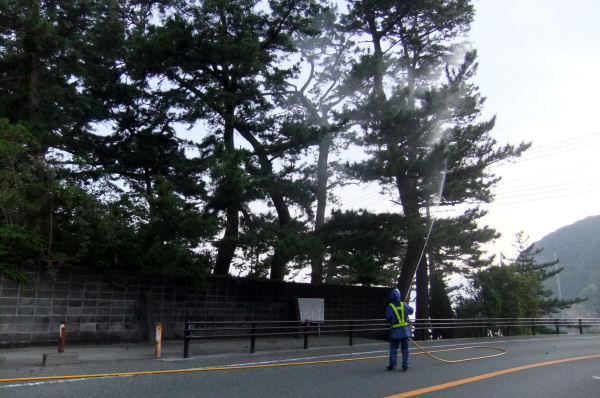 - 早朝には、町内の海岸沿いの松の美しい景観と自然環境を「松くい虫」から守るため、松くい虫防除の薬剤地上散布が行われました。