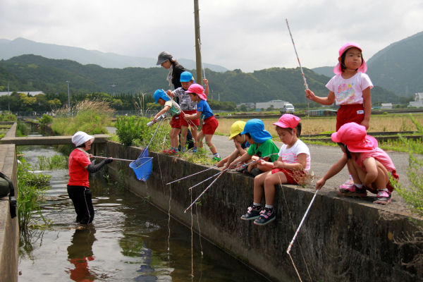 - 江奈区にある用水路では、松崎幼稚園岩科園の園児たちが手づくりの竿を使ってザリガニ取りを行いました。園児たちは、水草の陰に隠れているザリガニを見つけては「あそこに隠れてる」「そっちに行ったよ」と楽しそうでした。
