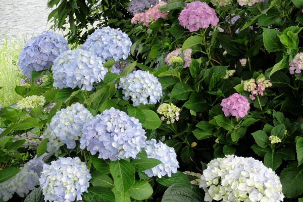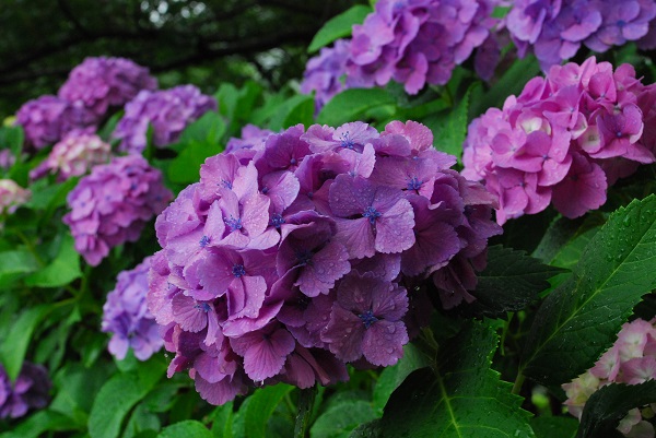 - 那賀川沿いのアジサイが雨に濡れ、色鮮やかに咲いています。