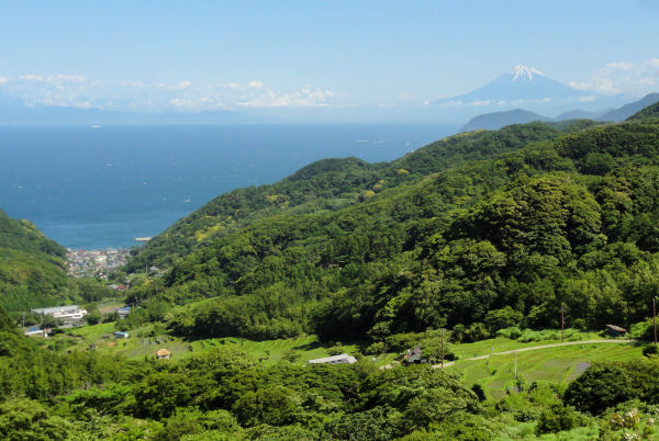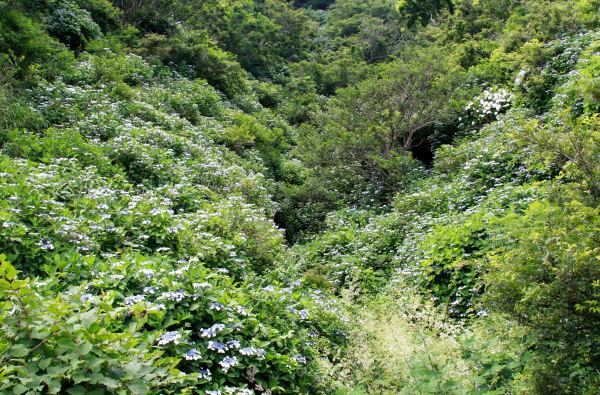 - 三浦地区を通る国道136号線沿いの山では、ガクアジサイが咲いていました。山の斜面を覆うように咲いているため、遠くから見ると斜面がうっすらと白く見えます。